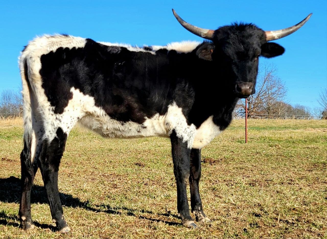 Beautiful True Black heifer! Her horns are rolling out and developing a beautiful twist! She's tall, beautiful, smooth, and well mannered!